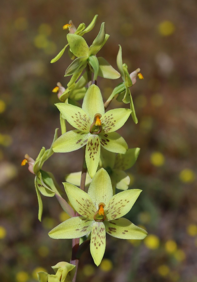 Beautiful large yellow sun orchid. The brown spots are variable, some having none and others being almost all brown. This orchid is found throughout the south west, mainly between the coast and the edge of the Wheatbelt. A favourite habitat is winter wet flats in Wandoo forests. This orchid is unique in being the only sun orchid with a hairy leaf.