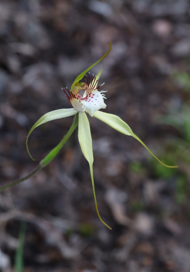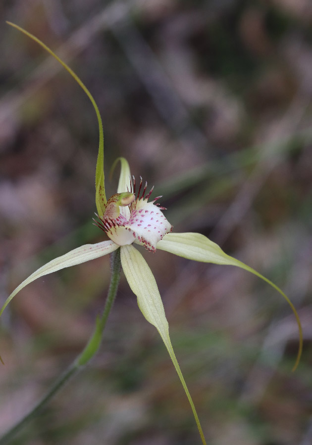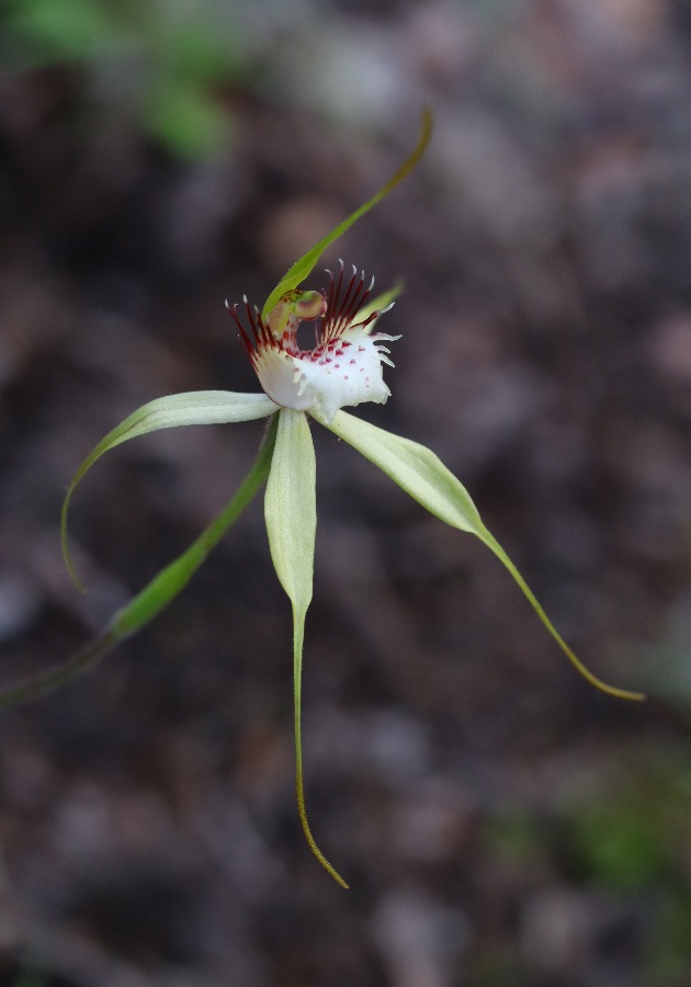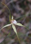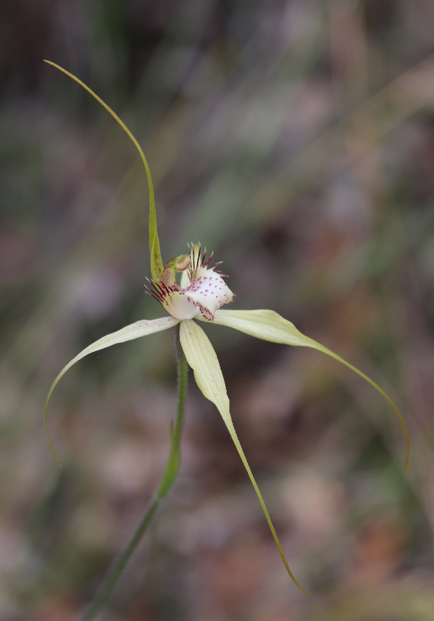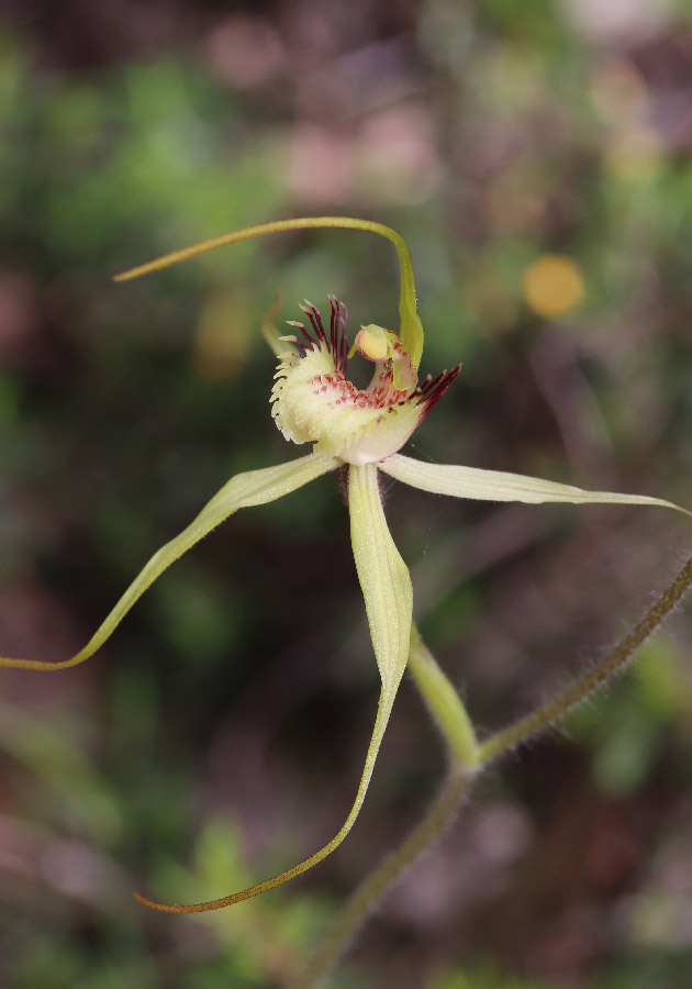 This orchid is similar to the Swamp Spider Orchid, Caladenia paludosa and is distinguished by the pale green-yellow colouring and lack of a red tip on the labellum. The orchid prefers more well-drained soils and is usually found in Marri woodland. This orchid is listed as threatened flora.
